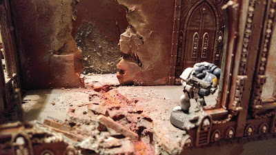 Damage from a lascannon blast on one side of the building, being surveyed by a brother from the Marines Errant, which was painted by Chris and eventually found his way into my possession through the murky shifting of time.